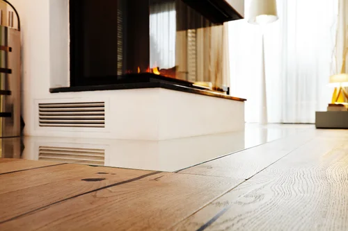 5000mm lange Eichendielen, handgehobelt und eingefärbt. Mit abgesenktem Boden am Kamin, damit die notwendige Glasplatte flächenbündig im Parkett liegt.
